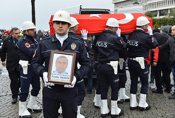 İzmir'de Adliye önünde gerçekleştirilen hain terör saldırısında, teröristleri fark edip canı pahasına müdahale ederek çok daha büyük bir felaketin önlenmesini sağlayan şehit polis memuru Fethi Sekin için İzmir Valiliği önünde tören düzenlendi.
