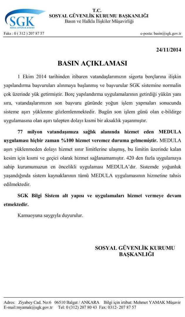 "Bugün son işlem günü olan e-bildirge uygulamasına olan aşırı talepten dolayı kısmi bir aksaklık yaşanmıştır. 77 milyon vatandaşımıza sağlık alanında hizmet eden MEDULA uygulaması hiçbir zaman yüzde 100 hizmet veremez duruma gelmemiştir. MEDULA aşırı yüklenmeden dolayı hizmet sınır limitlerine ulaşmış, bu limitin üzerinde kalan kesim için kısmi ve geçici olarak hizmet sağlanamamıştır. 420'den fazla uygulamaya sahip kurumumuzun en öncelikli uygulaması MEDULA'dır. Sistemde yoğunluk yaşandığında sistem kaynaklarının tümü MEDULA uygulamasının hizmetine tahsis edilmektedir. SGKBilgi Sistem alt yapısı ve uygulamaları hizmet vermeye devam etmektedir."