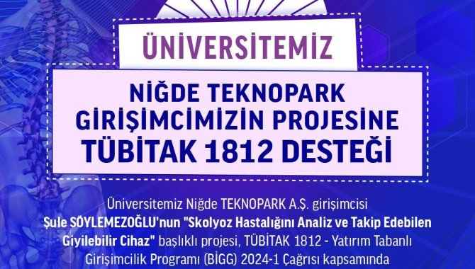 Niğde Teknopark A.Ş. girişimcisi Şule Söylemezoğlu'nun yürütücülüğünü yaptığı "Skolyoz Hastalığını Analiz ve Takip Edebilen Giyilebilir Cihaz" başlıklı projeyle skolyoz hastalarına tedavi süreçlerinde büyük bir yenilik ve kolaylık sağlanması amaçlanıyor.