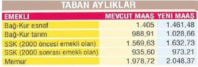 Tahminler gerçekleşirse en düşük maaş; memur emeklilerinde bin 978 liradan 2 bin 48 liraya, esnaf emeklilerinde bin 405 liradan bin 461 liraya, 2000'den önce emekli olan SSK'lılarda bin 569 liradan bin 632 liraya, 2000'den sonra emekli olan SSK'lılarda ise 935,60 liradan 973,21 liraya çıkacak.