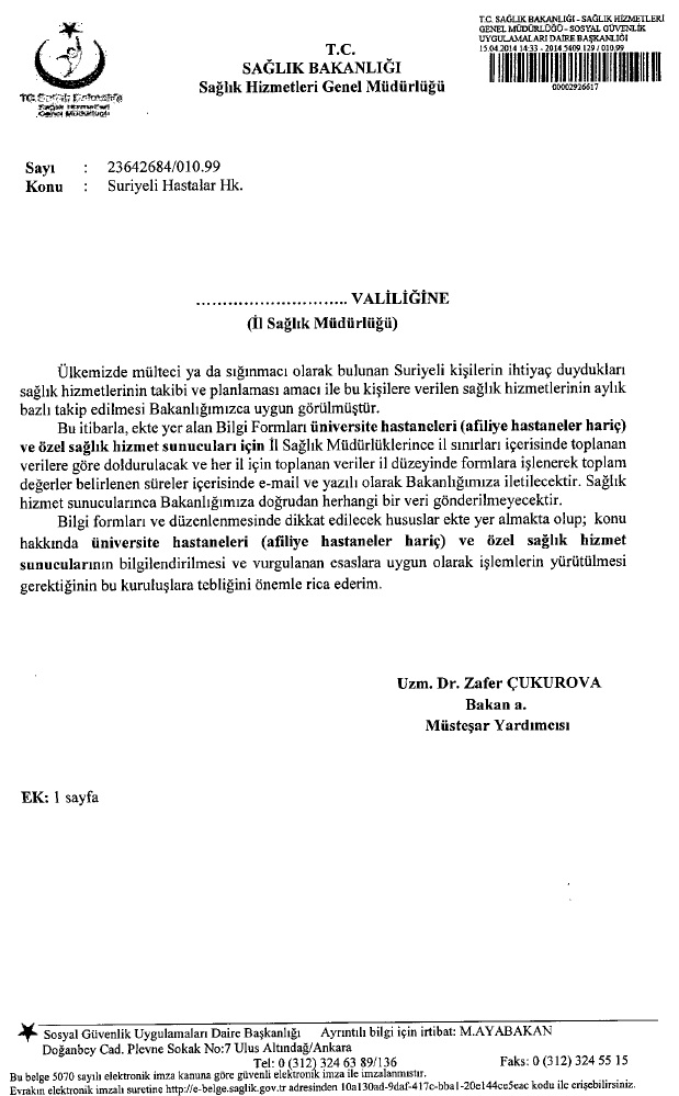 Sağlık Bakanlığı Sağlık Hizmetleri Genel Müdürlüğü tarafından Suriyeli hastalara verilen sağlık hizmetleri hakkında duyuru yayımlandı.