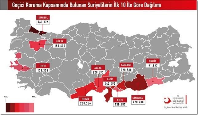 Türkiye'de 3.5 milyonu aşkın Suriyeli sığınmacıların en çok yaşadığı illere baktığımızda İstanbul, Şanlıurfa, Gaziantep, Hatay, Adana, Mersin, Bursa, İzmir ve Kilis bulunuyor.