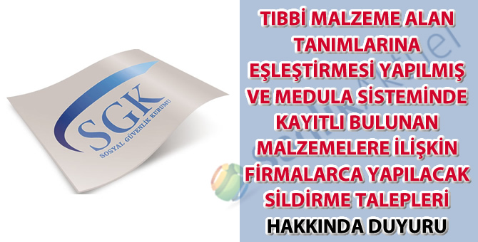 TIBBİ MALZEME ALAN TANIMLARINA EŞLEŞTİRMESİ YAPILMIŞ VE MEDULA SİSTEMİNDE KAYITLI BULUNAN MALZEMELERE İLİŞKİN FİRMALARCA YAPILACAK SİLDİRME TALEPLERİ HAKKINDA DUYURU