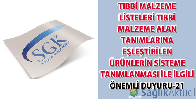 “Tıbbi Malzeme Listeleri Tıbbi Malzeme Alan Tanımlarına Ürünlerin Eşleştirilmesi ile İlgili Önemli Duyuru-20” kapsamında firmalarca yapılan eşleştirmeler Kurumumuzca herhangi bir değerlendirmeye tabi tutulmaksızın firmaların kendi beyanları doğrultusunda eşleştirdikleri SUT kodları bazında 1 Mayıs 2016 tarihi itibariyle sisteme tanımlanacak olup, söz konusu barkodlar duyuru eki EK-1 Listede yer almaktadır. Ayrıca duyuru eki EK-1 Listede; “Tıbbi Malzeme Listeleri Tıbbi Malzeme Alan Tanımlarına Eşleştirilen Ürünlerin MEDULA’ya Tanımlanması ile İlgili Önemli Duyuru-13-16-19” kapsamında sisteme tanımlanmış olan barkodlar da yer almaktadır.