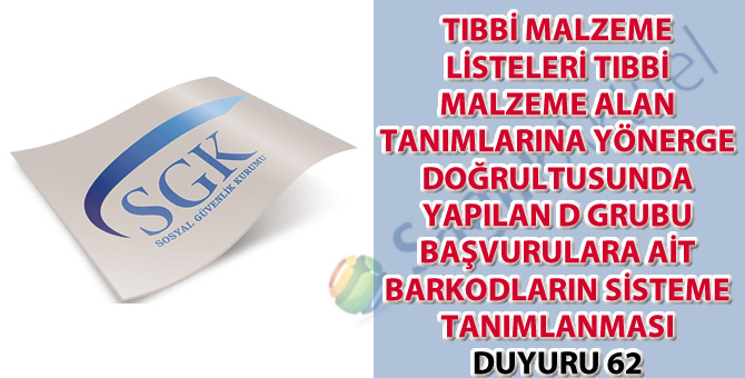 TIBBİ MALZEME LİSTELERİ TIBBİ MALZEME ALAN TANIMLARINA YÖNERGE DOĞRULTUSUNDA YAPILAN D GRUBU BAŞVURULARA AİT BARKODLARIN SİSTEME TANIMLANMASI DUYURU 62