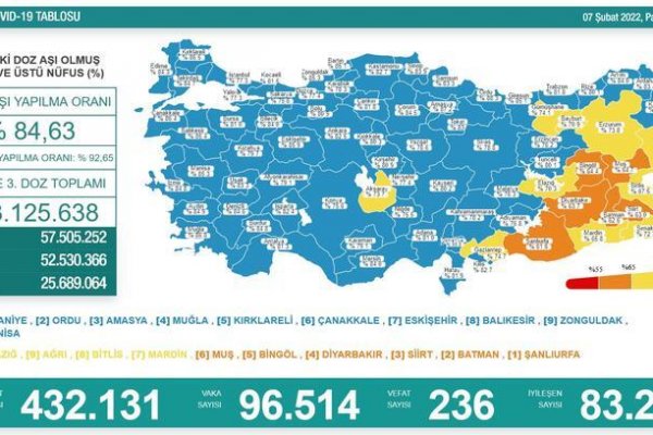 Buna göre, son 24 saatte 432 bin 131 Kovid-19 testi yapıldı, 96 bin 514 kişinin testi pozitif çıktı, 236 kişi yaşamını yitirdi, iyileşenlerin sayısı 83 bin 274 oldu.