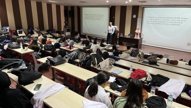 Aytekin, Tıp Fakültesi Amfi Salonu'nda düzenlenen programda, Farkındalık Ayı'nda meme kanserine dikkati çekmek için öğrencilerle bir araya geldi.