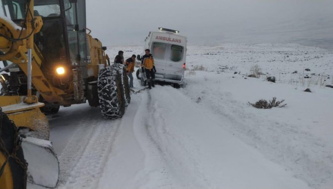 Haber verilmesi üzerine bölgeye giden Büyükşehir Belediyesi karla mücadele ekipleri, ambulansı saplandığı yerden çıkardı.