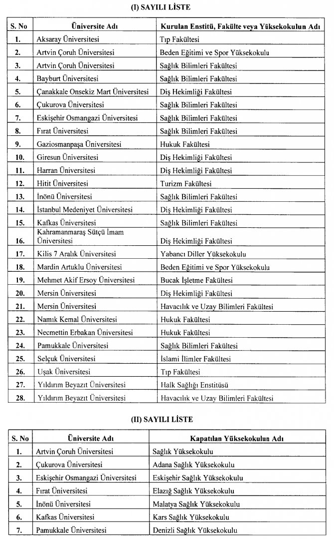 MADDE 1 – (1) Ekli (I) sayılı listede belirtilen yükseköğretim kurumlarına bağlı olarak karşılarında belirtilen fakülte, enstitü ve yüksekokullar kurulmuş, ekli (II) sayılı listede belirtilen yükseköğretim kurumları bünyesinde yer alan yüksekokullar kapatılmıştır.