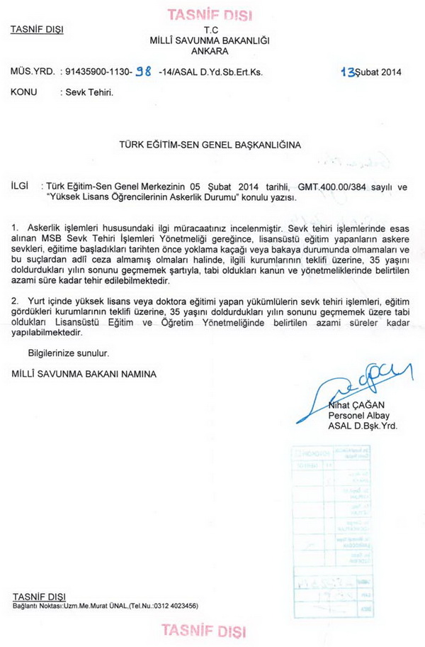 Türk Eğitim-Sen tarafından Askerlik sevk tehiri Yönetmeliği'nin 12. maddesinde yüksek lisans ve doktora öğrencilerinin sevk tehirine ilişkin hükmün yüksek lisans öğrencilerine de uygulanması gerektiğine ilişkin Milli Savunma Bakanlığı'na yazılan yazıya cevap geldi.
