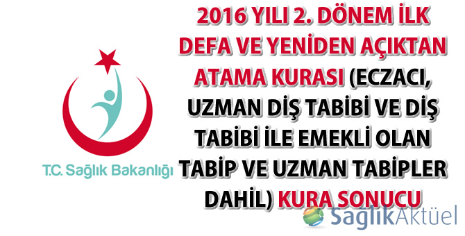 2016 yılı 2. dönem ilk defa ve yeniden açıktan atama kurası (Eczacı ve diş tabipleri ile emekli olan tabip ve uzman tabipler dahil) kura sonuçlarıSağlık Bakanlığı Yönetim Hizmetleri Genel Müdürlüğü tarafından 2016 yılı 2. dönem ilk defa ve yeniden açıktan atama kurası (Eczacı ve diş tabipleri ile emekli olan tabip ve uzman tabipler dahil) kura sonuçları yayımlandı.12 Nisan 2016 Salı 17:36YÖNETİM HİZMETLERİ GENEL MÜDÜRLÜĞÜ