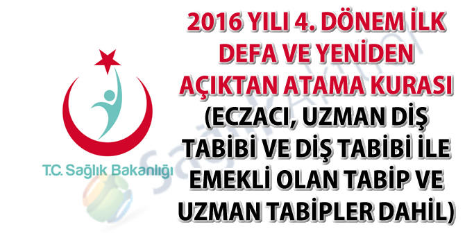 2016 yılı 4. dönem ilk defa ve yeniden açıktan atama kurası (Eczacı ve diş tabipleri ile emekli olan tabip ve uzman tabipler dahil)Sağlık Bakanlığı Yönetim Hizmetleri Genel Müdürlüğü tarafından 2016 yılı 4. dönem ilk defa ve yeniden açıktan atama kurası (Eczacı ve diş tabipleri ile emekli olan tabip ve uzman tabipler dahil) ilanı yayımlandı. (Kura takvimi güncellendi)04 Ağustos 2016 Perşembe 08:48YÖNETİM HİZMETLERİ GENEL MÜDÜRLÜĞÜ
