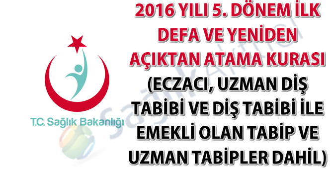 2016 yılı 5. dönem ilk defa ve yeniden açıktan atama kurası (Eczacı ve diş tabipleri ile emekli olan tabip ve uzman tabipler dahil)Sağlık Bakanlığı Yönetim Hizmetleri Genel Müdürlüğü tarafından 2016 yılı 5. dönem ilk defa ve yeniden açıktan atama kurası (Eczacı ve diş tabipleri ile emekli olan tabip ve uzman tabipler dahil) ilanı yayımlandı.21 Eylül 2016 Çarşamba 16:50YÖNETİM HİZMETLERİ GENEL MÜDÜRLÜĞÜ