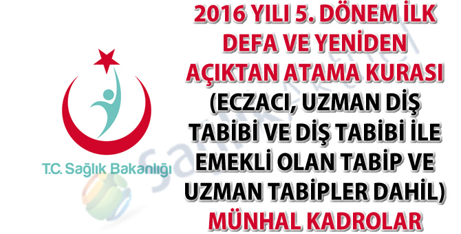 2016 yılı 5. dönem ilk defa ve yeniden açıktan atama kurası (Eczacı ve diş tabipleri ile emekli olan tabip ve uzman tabipler dahil) münhal kadrolarSağlık Bakanlığı Yönetim Hizmetleri Genel Müdürlüğü tarafından 2016 yılı 5. dönem ilk defa ve yeniden açıktan atama kurası (Eczacı ve diş tabipleri ile emekli olan tabip ve uzman tabipler dahil) münhal kadrolar yayımlandı.22 Eylül 2016 Perşembe 16:02YÖNETİM HİZMETLERİ GENEL MÜDÜRLÜĞÜ