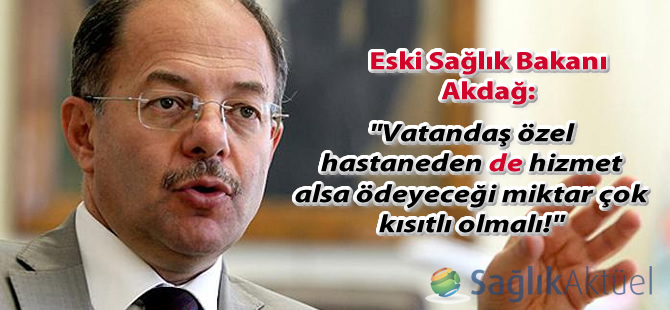Akdağ: Vatandaşın özel hastaneye ödeyeceği miktar çok kısıtlı olmalıEski Sağlık Bakanı Akdağ: "Hani özel hastaneye gidince fark ödeme meselesi var ya... Ben onun belli bir orandan fazla olmasına karşıyım. Şu anda bu noktada aşırılığa gitmeye doğru bir eğilim var ama gidilmemeli"26 Şubat 2015 Perşembe 19:25ÖZEL SAĞLIK SEKTÖRÜ