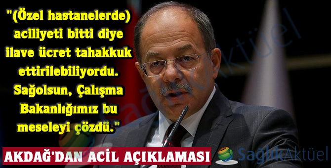 Akdağ: "Özel hastanelerde acil vakalardan fark alınmayacak"Sağlık Bakanı Recep Akdağ, özel hastanelerden acil olarak alınan hizmetlerin geri ödemesine ilişkin, "(Özel hastanelerde) aciliyeti bitti diye ilave ücret tahakkuk ettirilebiliyordu. Sağolsun, Çalışma Bakanlığımız bu meseleyi çözdü." dedi.08 Eylül 2016 Perşembe 15:14SAĞLIK BAKANLIĞI