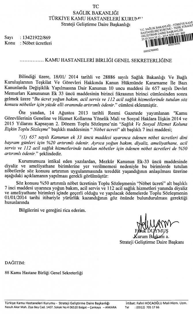 Sağlık Bakanlığı Türkiye Kamu Hastaneleri Kurumu tarafından Diyaliz ve ameliyathanelerde % 50 nöbet ücreti verilmesi hakkında duyuru yayımlandı.