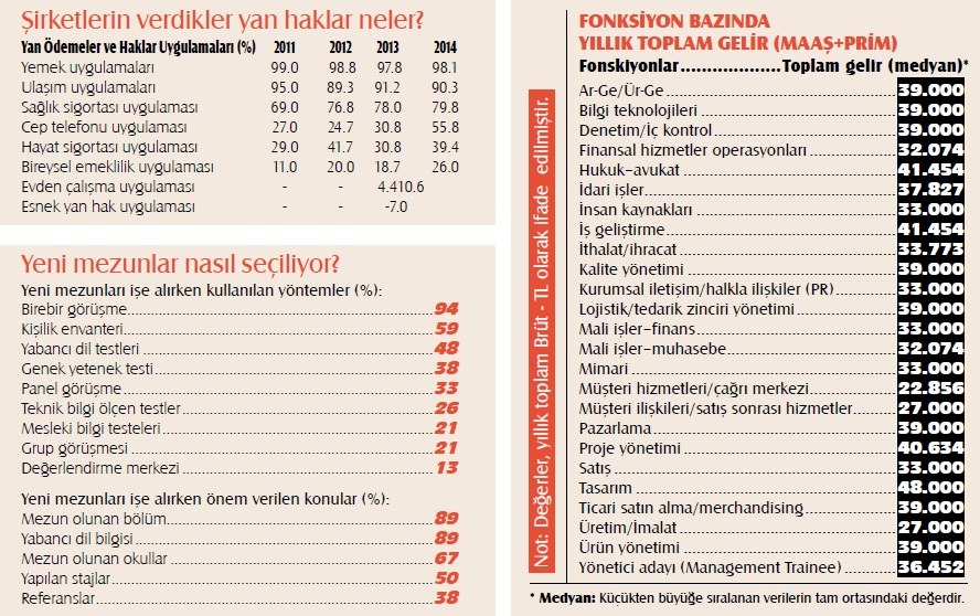 Araştırmaya göre 2014 yılında hukuk, proje yönetimi ve iş geliştirme fonksiyonlarının ücret medyan değerlerinin diğer fonksiyonlara göre daha yüksek olduğu belirlendi.