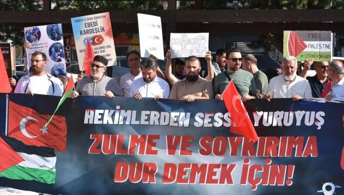 Kent merkezindeki Lala Mustafa Paşa Camisi önünde bir araya gelen doktor ve tıp fakültesi öğrencilerinin de aralarında bulunduğu sağlık çalışanları, Türk, Filistin ve Doğu Türkistan bayrakları eşliğinde, taşıdıkları döviz ve pankartlarla Yakutiye Medresesi'ne yürüdü.