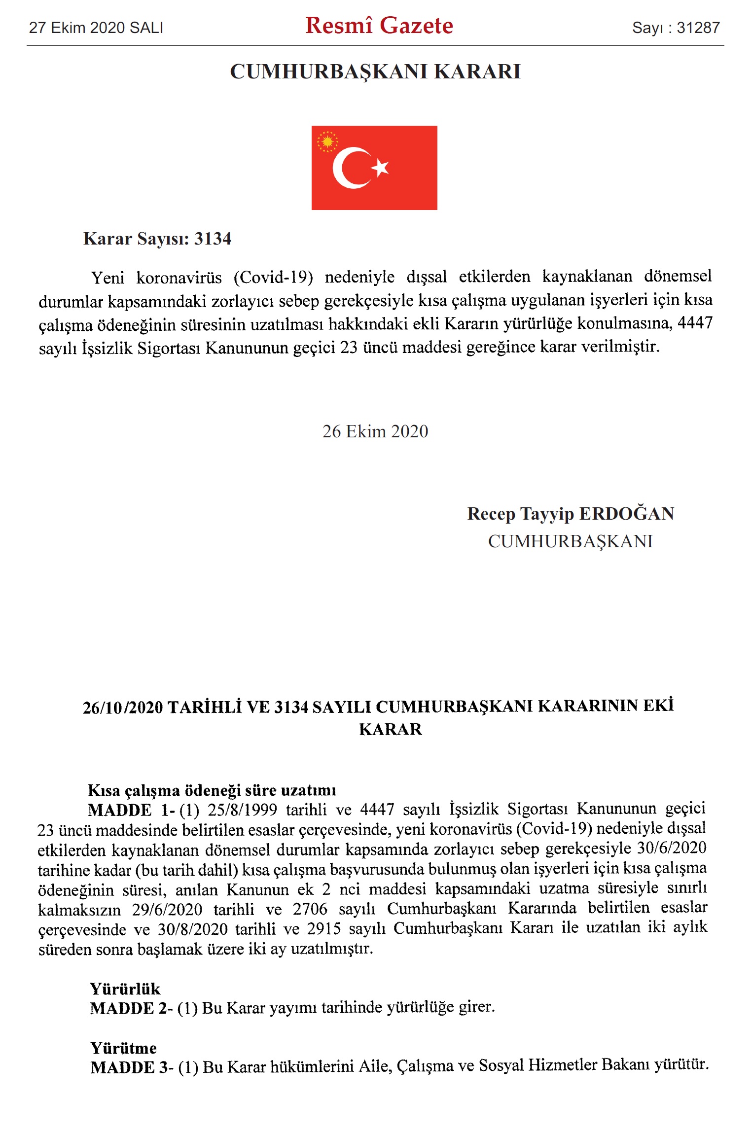 Kısa çalışma ödeneği ile işten çıkarma yasağının süresini 2 ay daha uzatan Cumhurbaşkanı kararı Resmi Gazete'de yayımlandı.