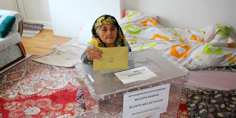Bingöl’de rahatsızlığı nedeniyle yatalak olan 94 yaşındaki Ayşe Bozağaç, görevlilerin evine götürdüğü seyyar sandıkta oyunu kullandı. Polis gözetiminde, kent merkezinde yaklaşık 30 yatalak hastaya seyyar sandığı evlerine götürerek, oy kullanma hizmeti sunuldu.