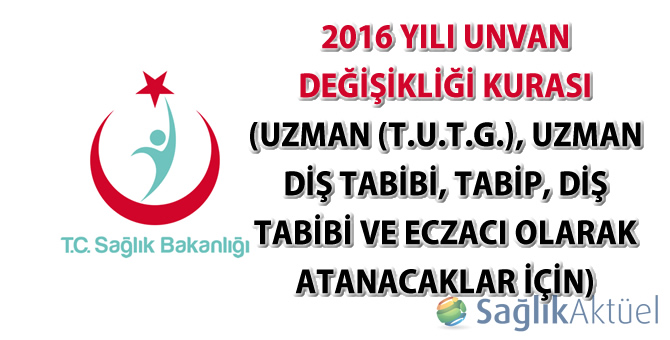 2016 Yılı Unvan Değişikliği Kurası (Uzman (T.U.T.G.), Uzman Diş Tabibi, Tabip, Diş Tabibi ve Eczacı Olarak Atanacaklar İçin)Sağlık Bakanlığı Yönetim Hizmetleri Genel Müdürlüğü tarafından 2016 Yılı Unvan Değişikliği Kurası (Uzman (T.U.T.G.), Uzman Diş Tabibi, Diş Tabibi ve Eczacı Olarak Atanacaklar İçin) yayımlandı.08 Ocak 2016 Cuma 11:11YÖNETİM HİZMETLERİ GENEL MÜDÜRLÜĞÜ